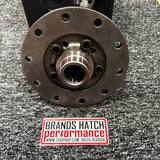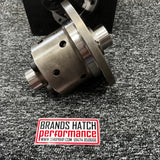 The helical gearing manages the distribution of friction within the LSD. When torque is applied to the helical gear system it creates force that pushes the gear into the differential body, thus creating friction. Increases of torque, increases the thrust force directly proprotional to the amount of torque. This allows the Blackline LSD to cope with considerable traction imbalance even under heavy power conditions, as would be the case on exiting a powered up corner. But at low torque conditions the LSD can differentiate quietly and smoothly, thus making the differential very suitable for normal road driving. The Blackline LSD uses the popular parallel axis helical geared configuration optimised for even load distribution. They are designed with a torque bias of 5:1 this means that if  one wheel loses traction then the wheel with the most grip can receive five times as much torque as the wheel that is slipping. However, five times zero is still zero, so all these helical LSD's work best when both wheels are 'planted' and some traction is still available on the slipping wheel. In practice this is rarely a problem as there is always some 'drag' on the slipping wheel, however some drivers expertly use left foot braking to partially lock the spinning wheel.
